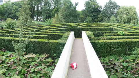 Het vierhoekige doolhof in het Amstelpark wordt omringt door water. De toegang tot het eilandje en het doolhof bestaat uit een stenen voetgangersbrug van twee verdiepingen. De onderste vormt de ingang, de bovenste de uitgang.